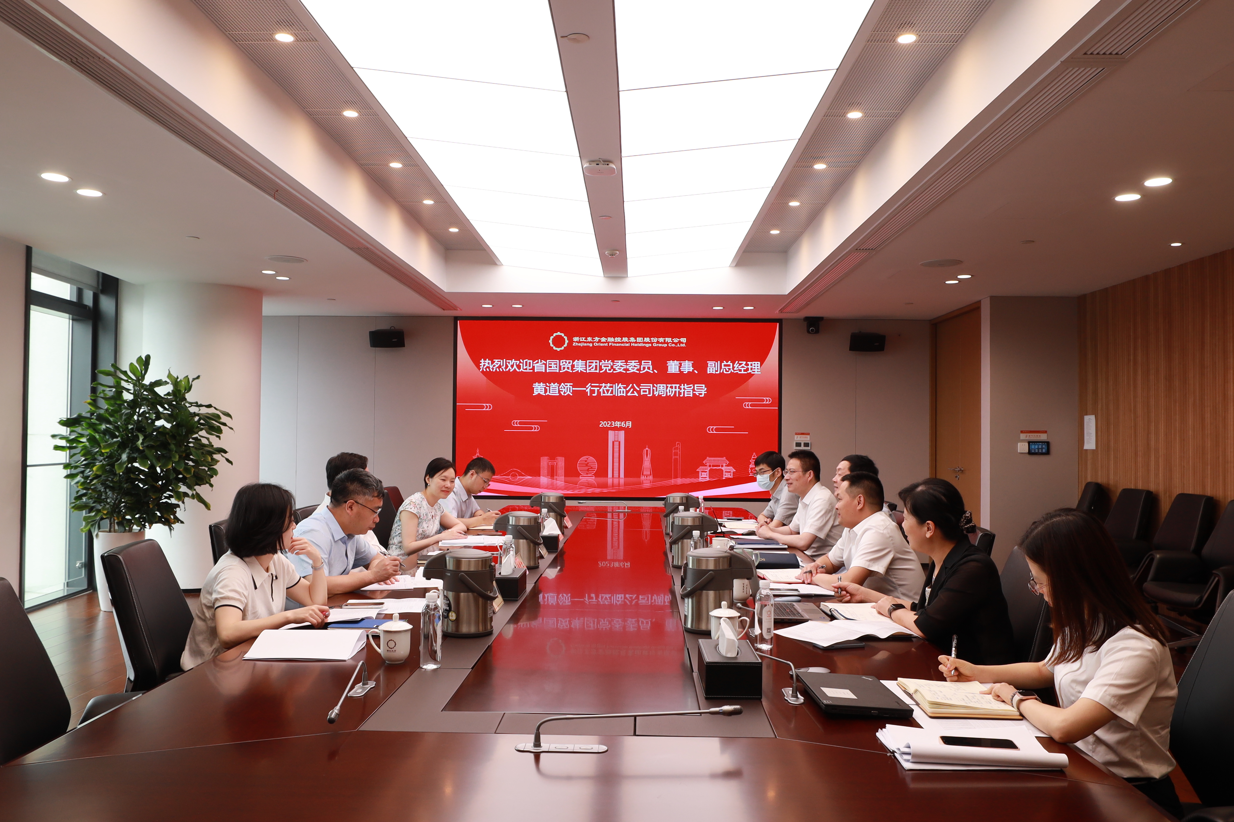 近日,省國(guó)貿(mào)集團(tuán)黨委委員、董事、副總經(jīng)理黃道領(lǐng)蒞臨公司調(diào)研指導(dǎo),集團(tuán)投資管理部副總經(jīng)理(主持工作)余冬筠,副總經(jīng)理曹學(xué)文陪同。浙江東方黨委副書(shū)記、總經(jīng)理徐曉東,黨委委員、副總經(jīng)理王正甲,投資管理部、資產(chǎn)財(cái)務(wù)部及東方產(chǎn)融相關(guān)人員參加調(diào)研交流。